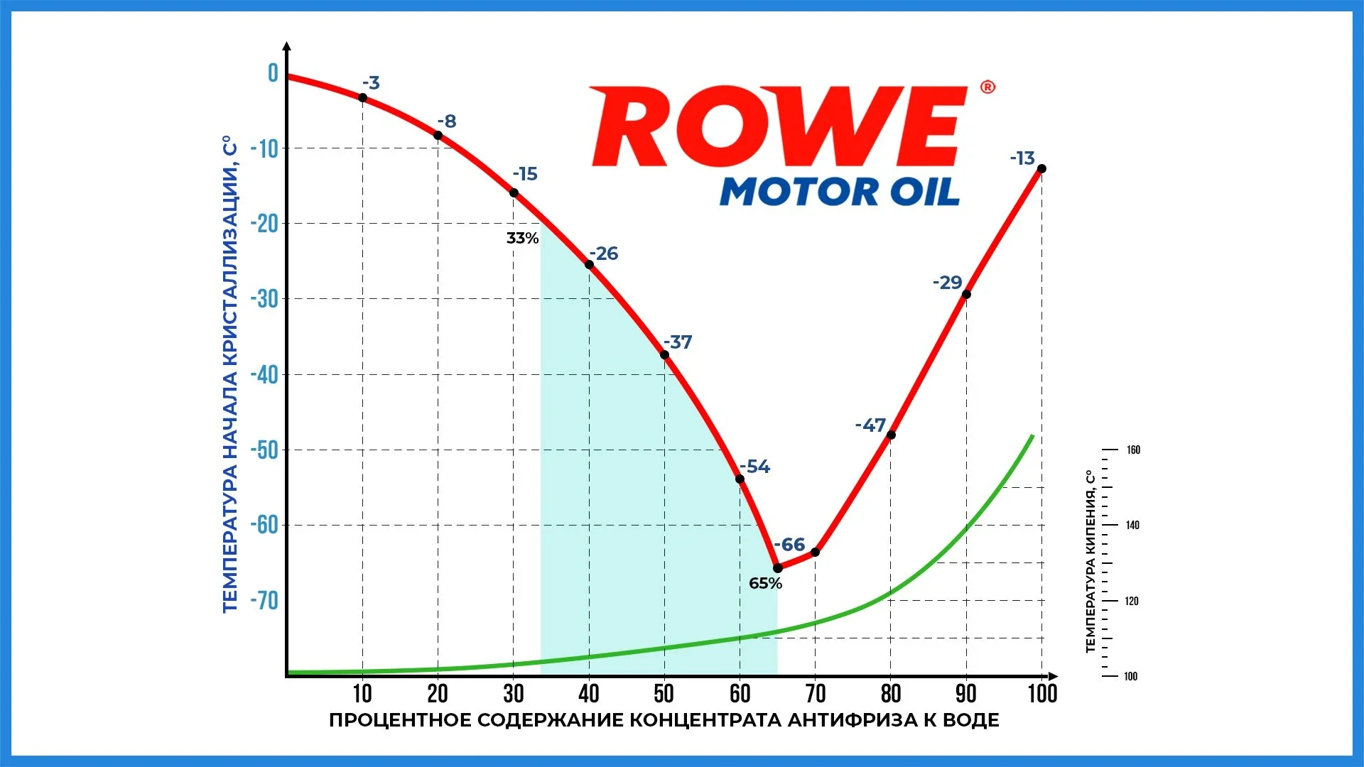 Для удобства подбора оптимальной температуры кристаллизации и кипения охлаждающей жидкости, составил для вас наглядный график необходимой концентрации антифриза.