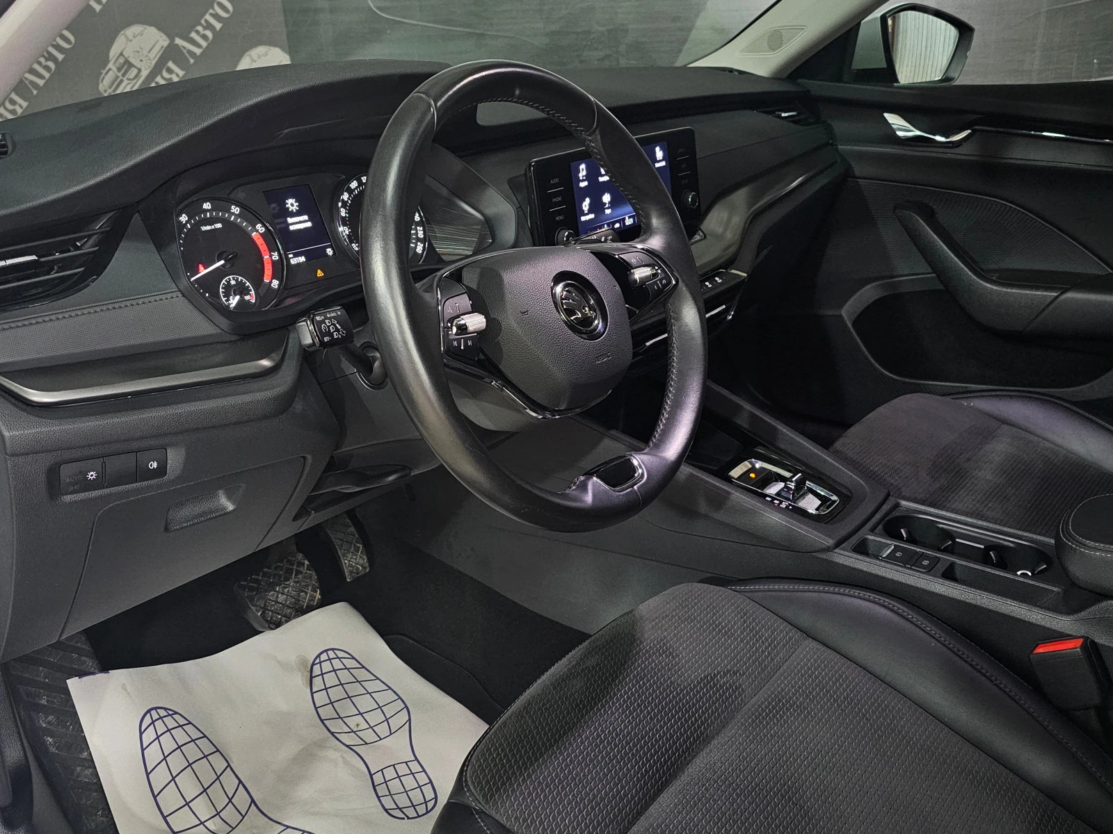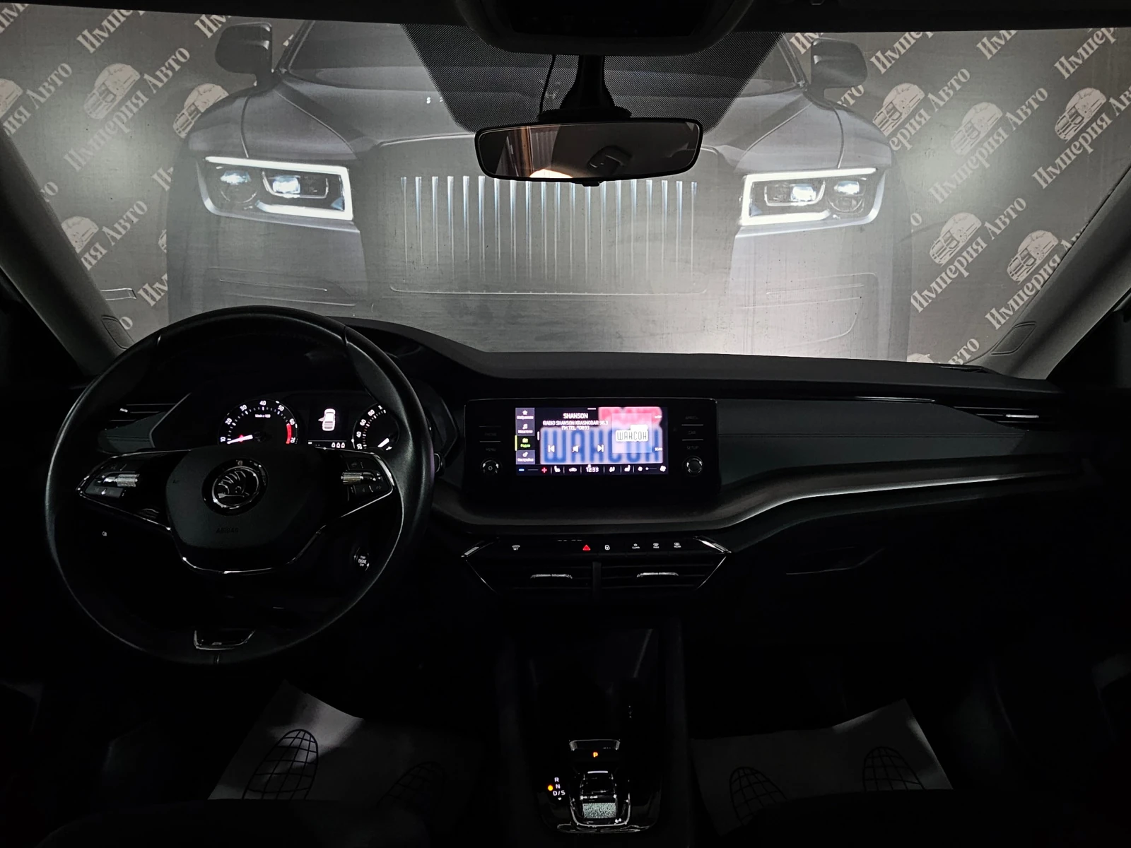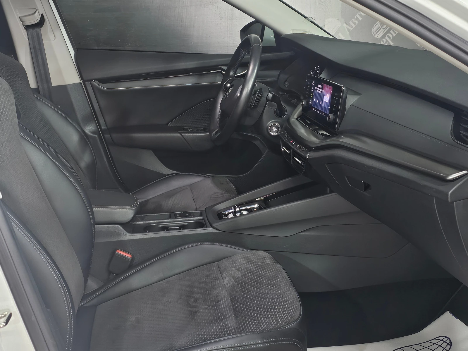 Отделка салона выполнена в тёмных тонах с комбинированной обивкой, что придаёт интерьеру лаконичный вид. Декоративная подсветка салона и обогрев рулевого колеса создают атмосферу уюта и комфорта. Подрулевые лепестки переключения передач и отделка кожей рычага КПП добавляют эстетическую привлекательность и удобство в использовании.