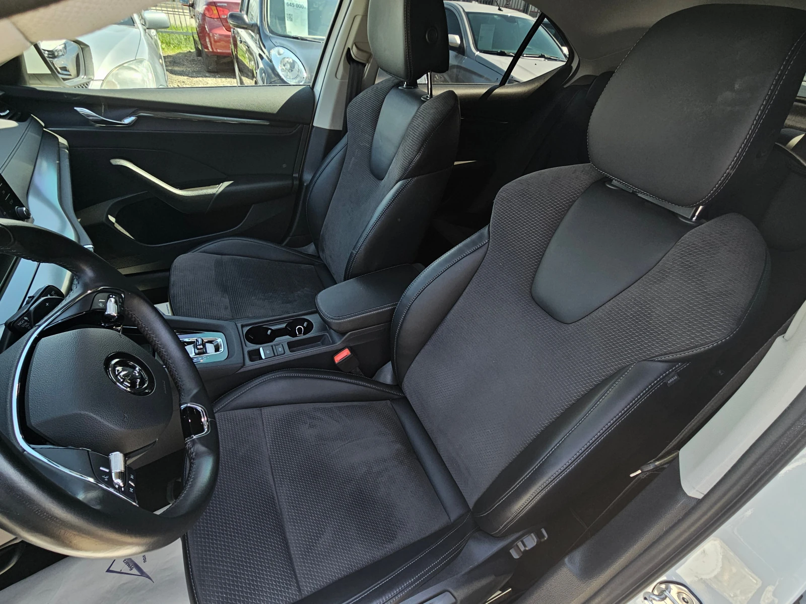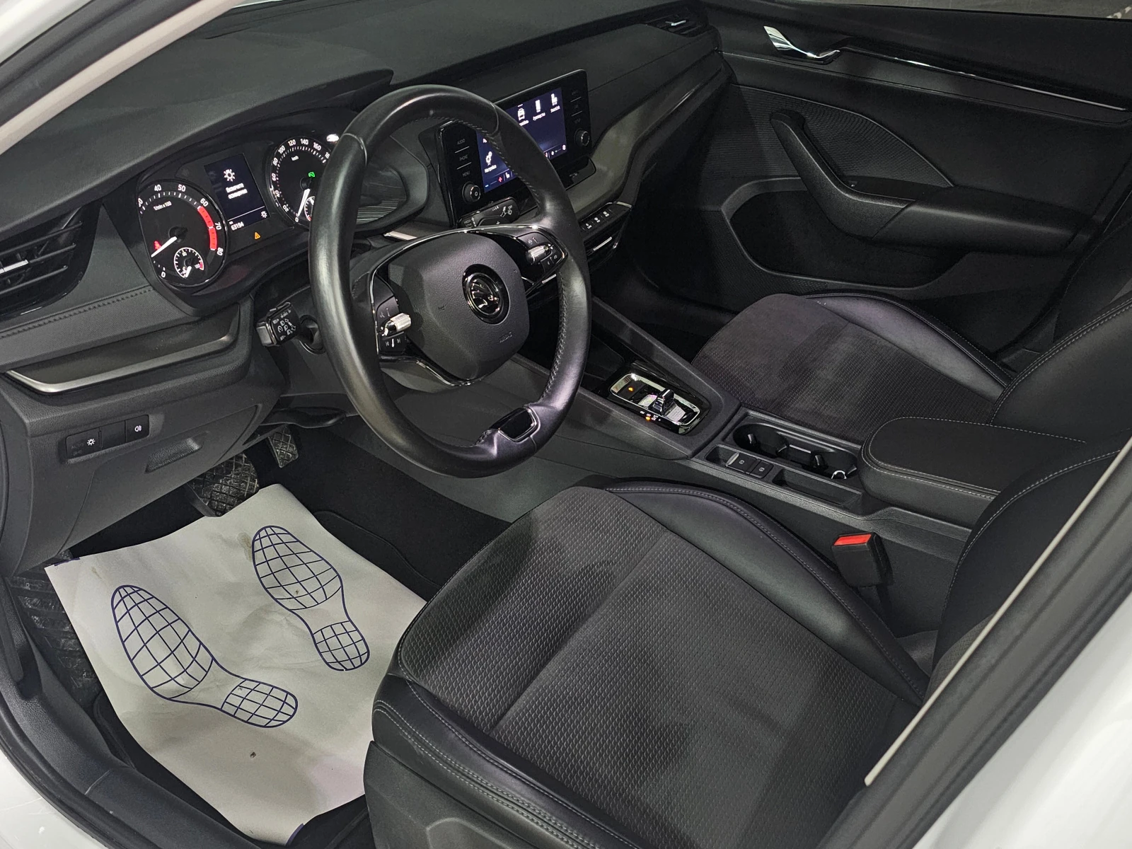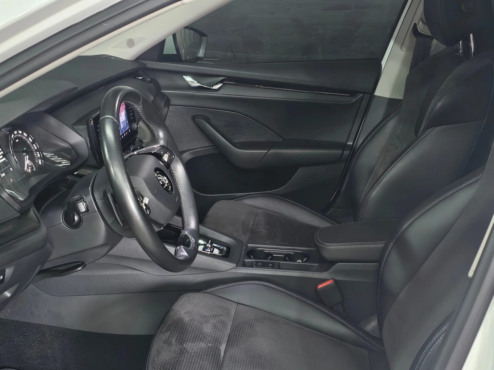 Отделка салона выполнена в тёмных тонах с комбинированной обивкой, что придаёт интерьеру лаконичный вид. Декоративная подсветка салона и обогрев рулевого колеса создают атмосферу уюта и комфорта. Подрулевые лепестки переключения передач и отделка кожей рычага КПП добавляют эстетическую привлекательность и удобство в использовании.