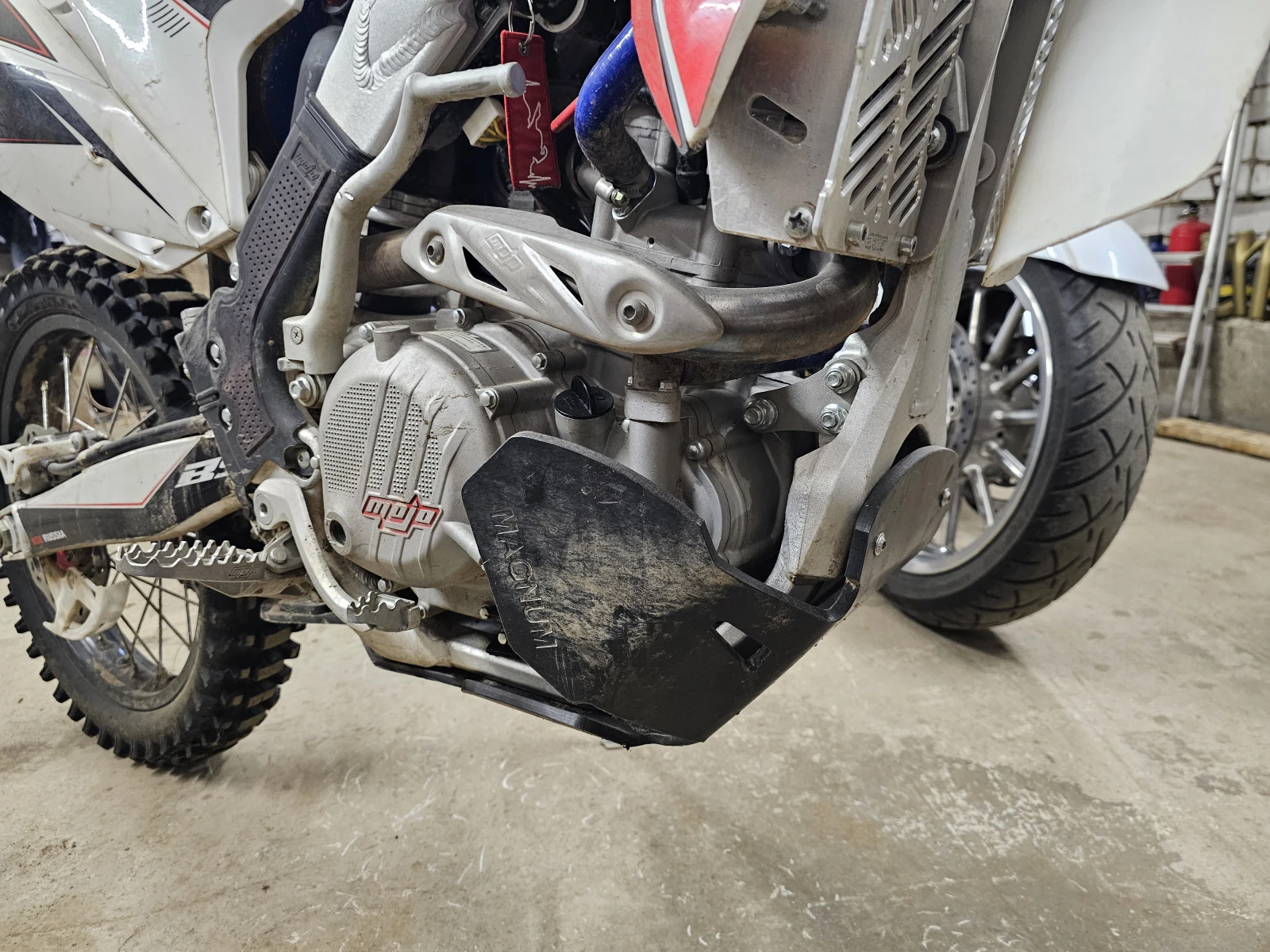 После покупки разобран, заново смазан, протянут, заменены масло и антифриз, установлена сальниковая цепь ЕК. Установлены металлические защиты рук и радиаторов, пластиковая защита картера магнум.
