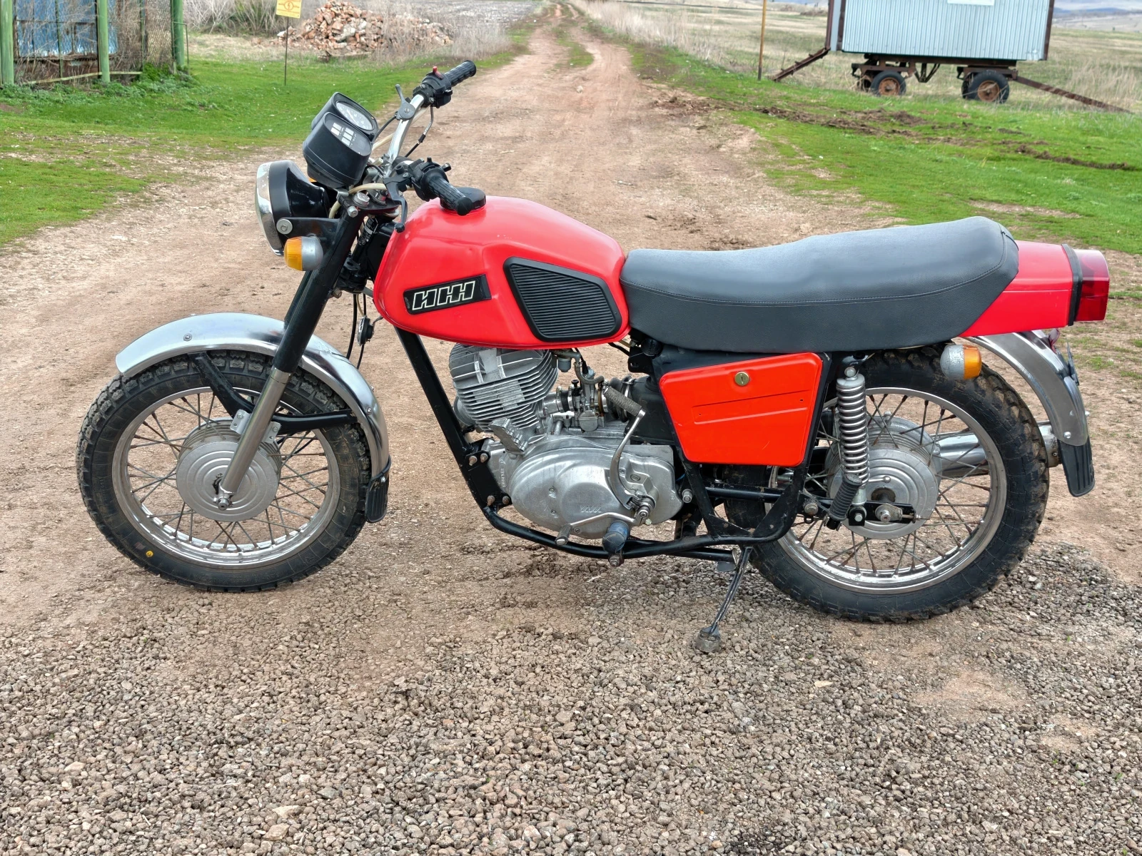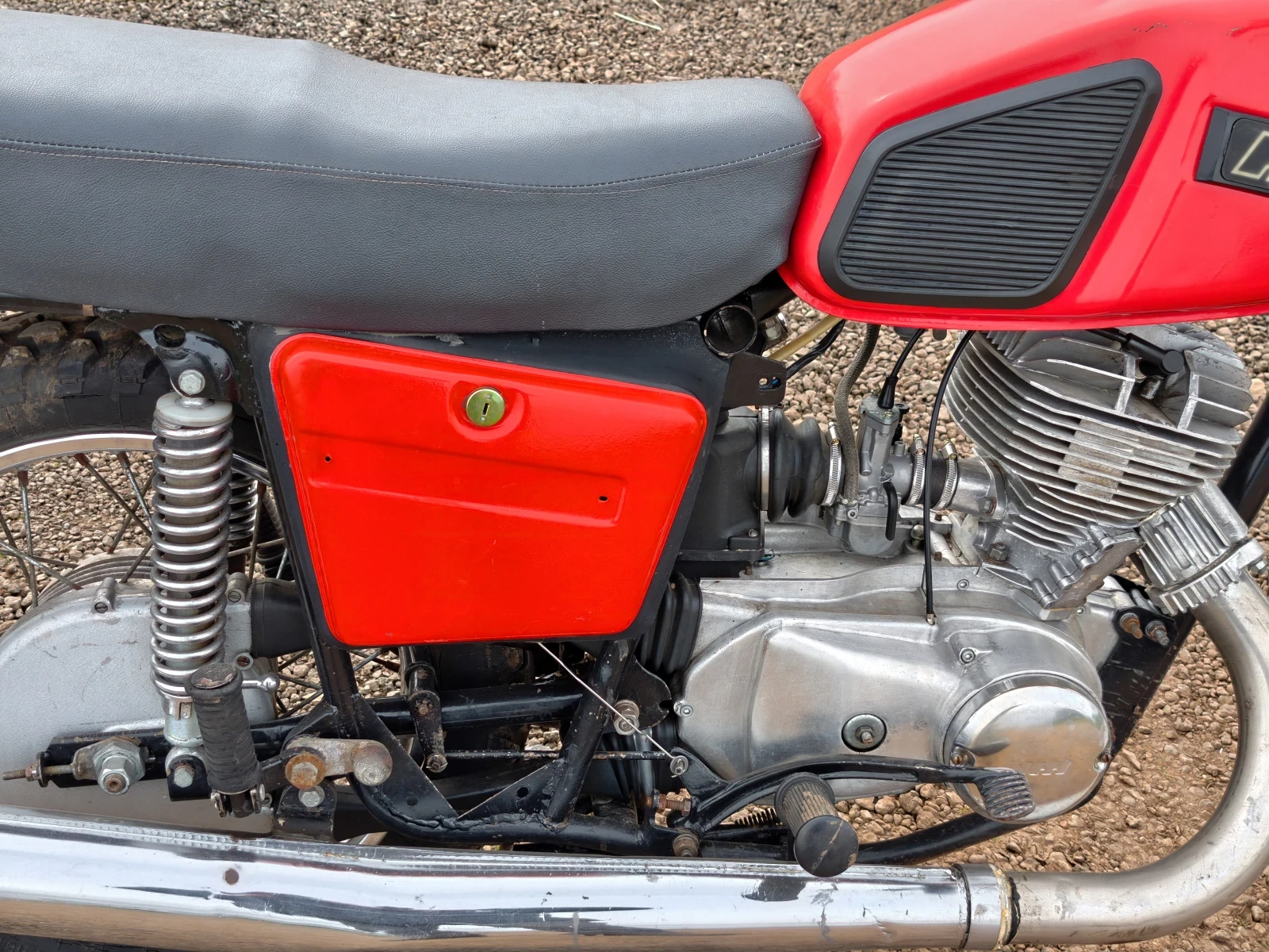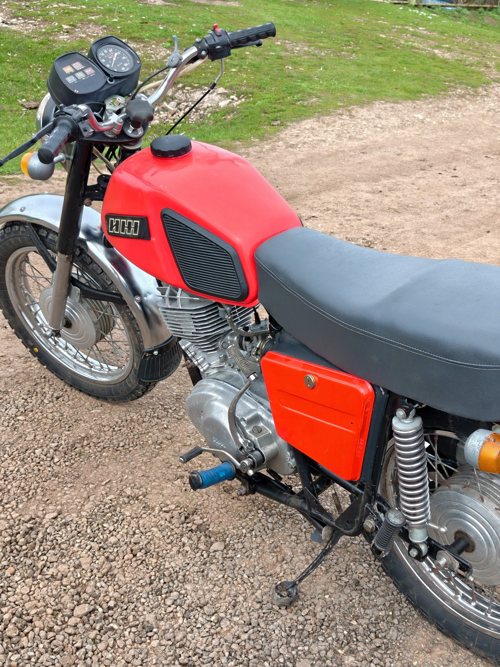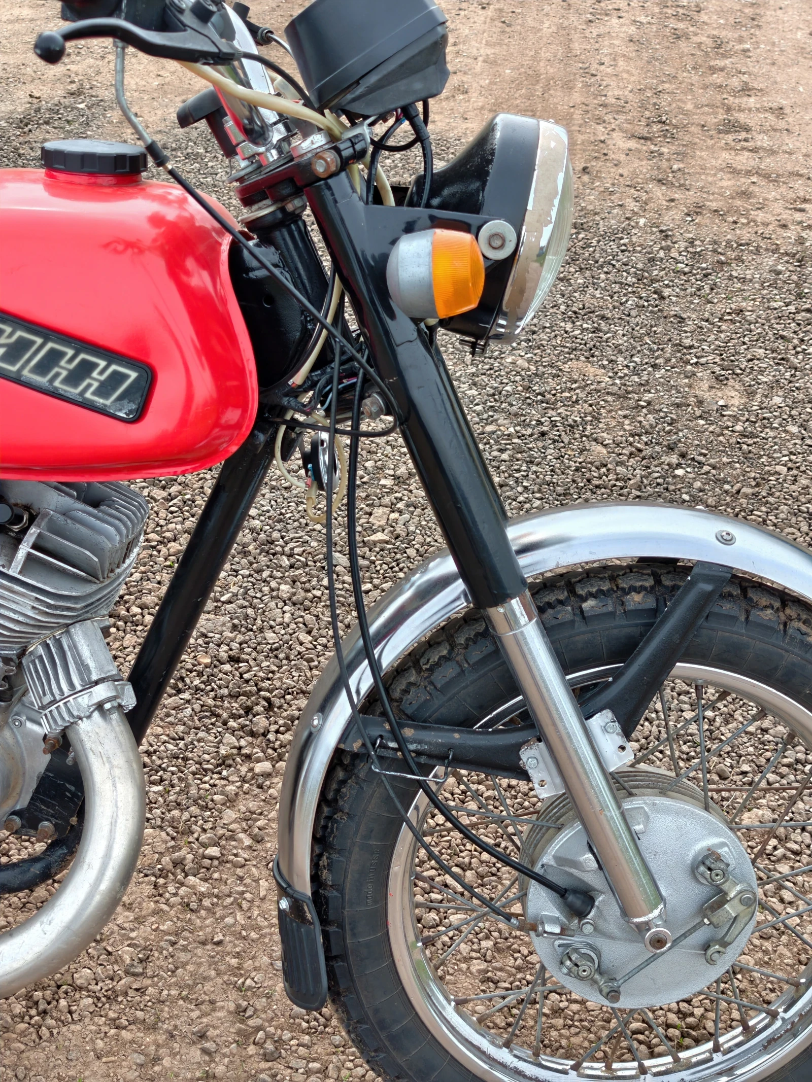 Перекрашивался полностью. Новая проводка, всё что должно гореть - горит, всё что моргать, моргает. Цилиндр расточен в первый ремонтный размер, установлено CDI зажигание, работает без аккумулятора. В коробке 1-2 передача от иж юпитера, более длинные, стоит 20-ая звезда. Перешивалось сиденье. И еще много чего сделано, что я не написал тут. В общем в мотоцикл вложено много сил и денег, делал для себя, для души. Собирался он в 2020 году, работает как часы, запускается с пол пинка, и едет очень бодро.