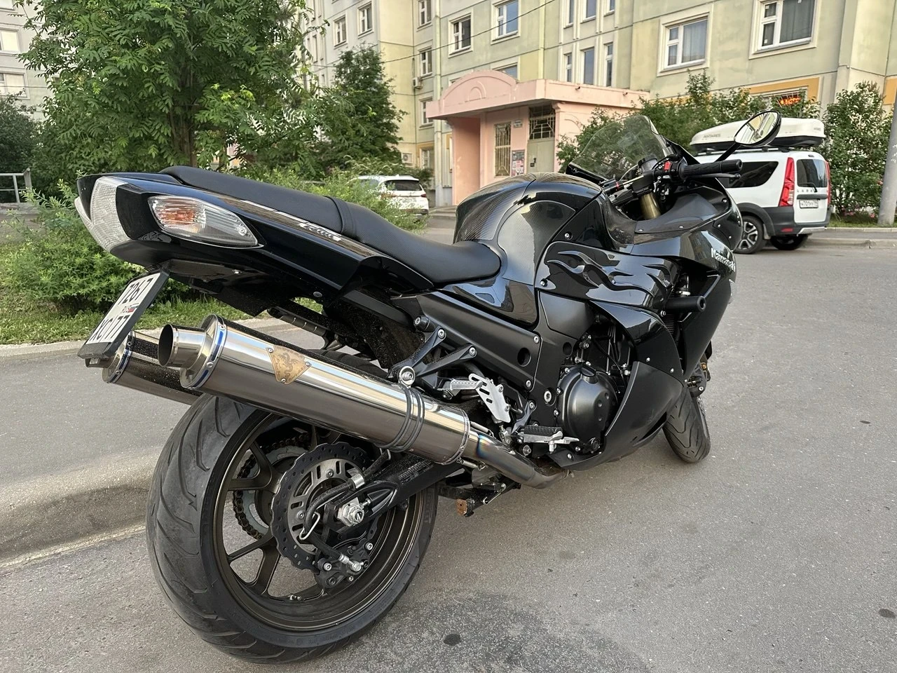 Привезён из японии в 2023 в декабре. Устранены все болячки(натяжитель, маслонасос крепление маятника к раме,) ревизия мотора когда устранили болячки. Из ништяков арм шланги перед зад, выхлоп виверна, высокое стекло. Есть кофр-горб и пластиковая заглушка второго номера.
