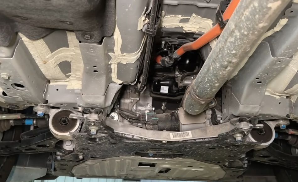 Под машиной видно: толстые привода для электромомента, алюминиевый подрамник, усиленный. Насосы электроусилителя, хорошие швы, все закрыто — но «естественно, не хватает антикора».