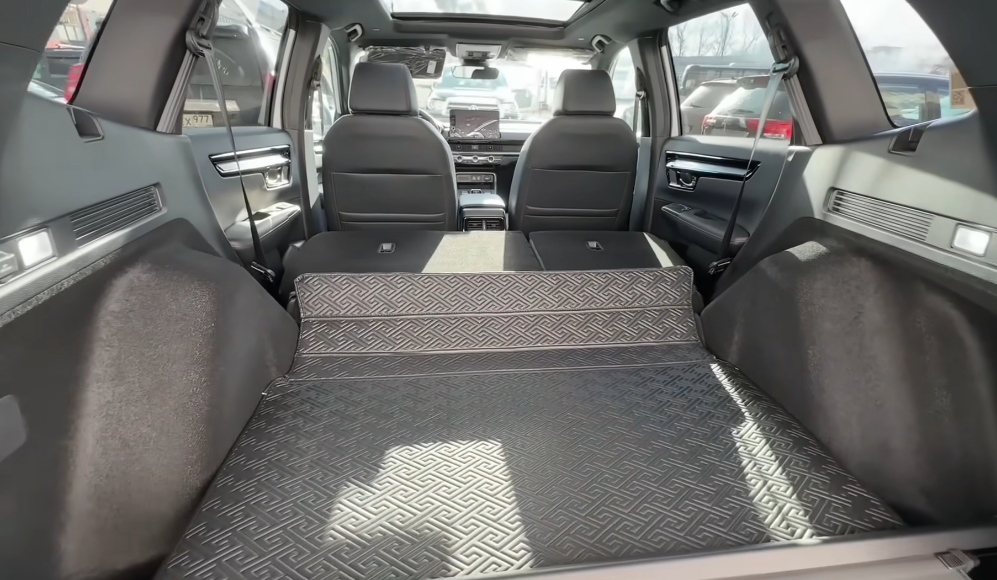 Сидения складываются электрически, но не создают ровный пол. Полезный объем багажника — 2166 литров со сложенными сиденьями, 1113 литров — без. Еще одна 12V розетка и ниша для мелочевки за счет гибридной архитектуры (батареи по центру днища).